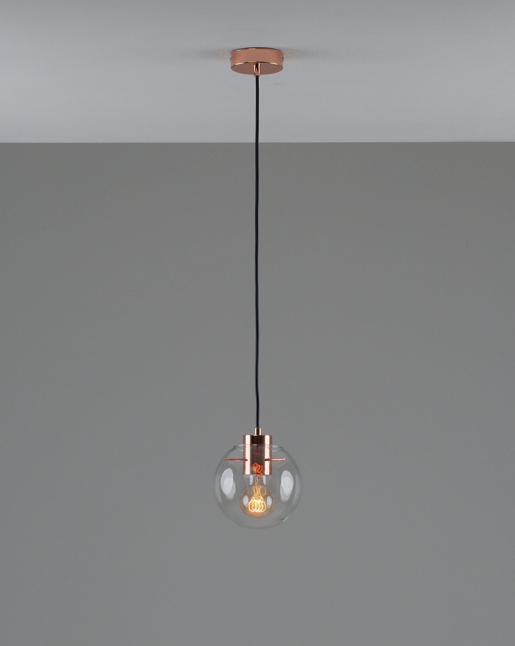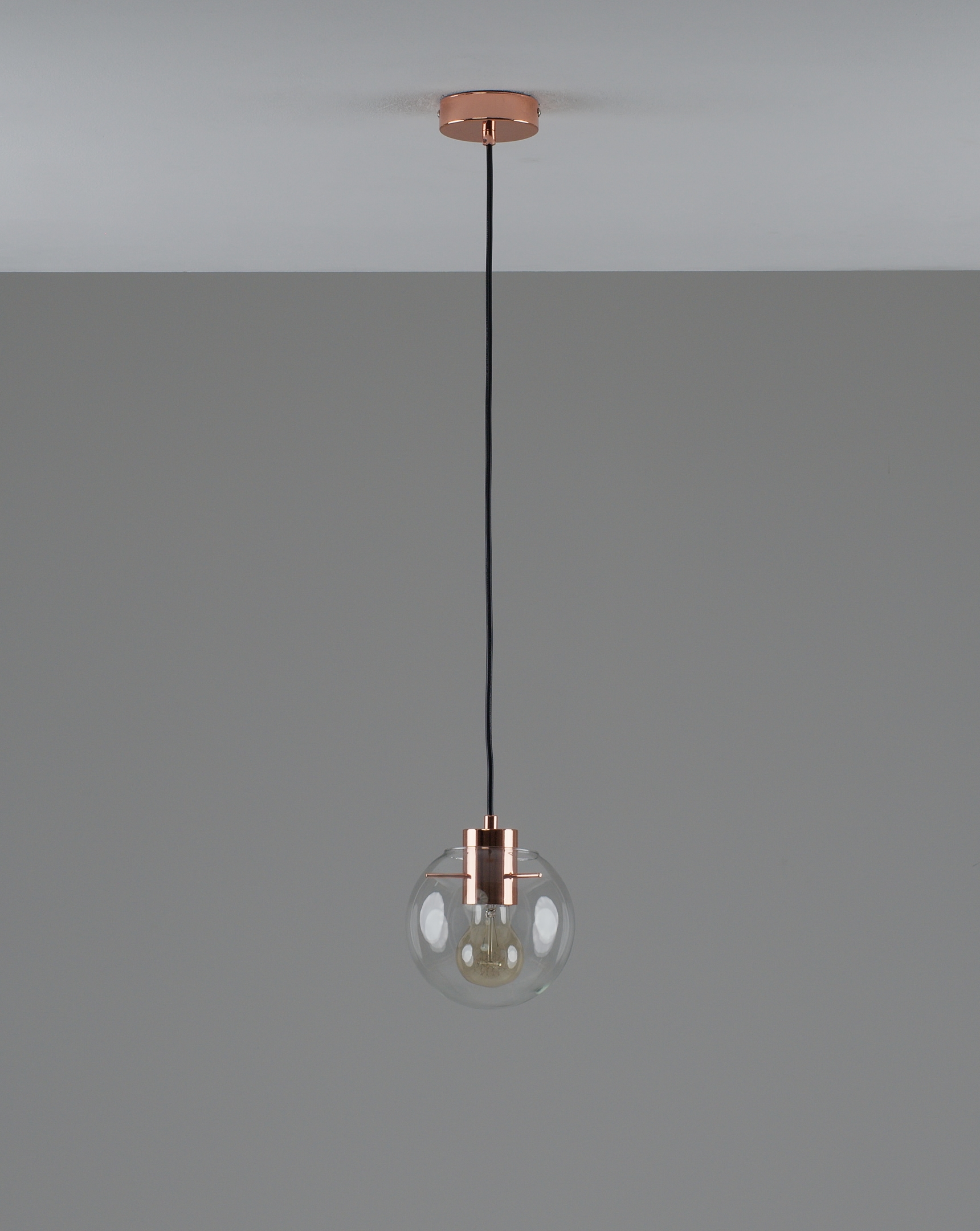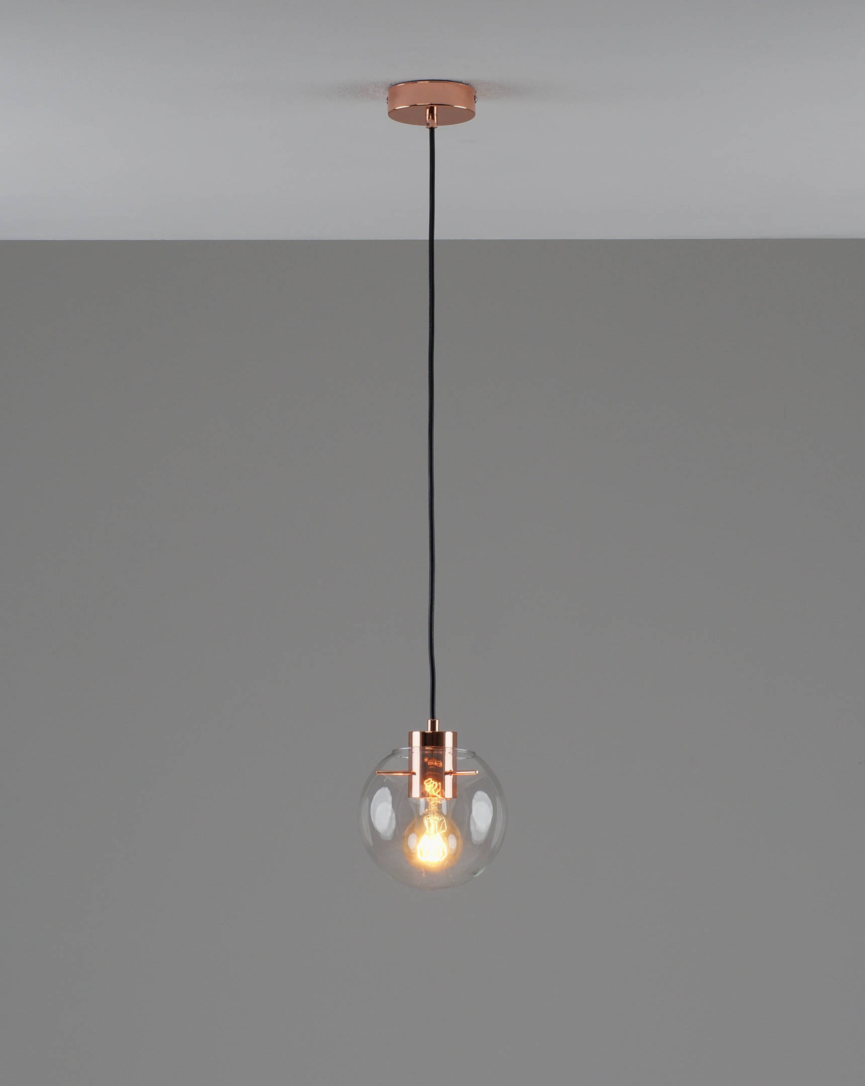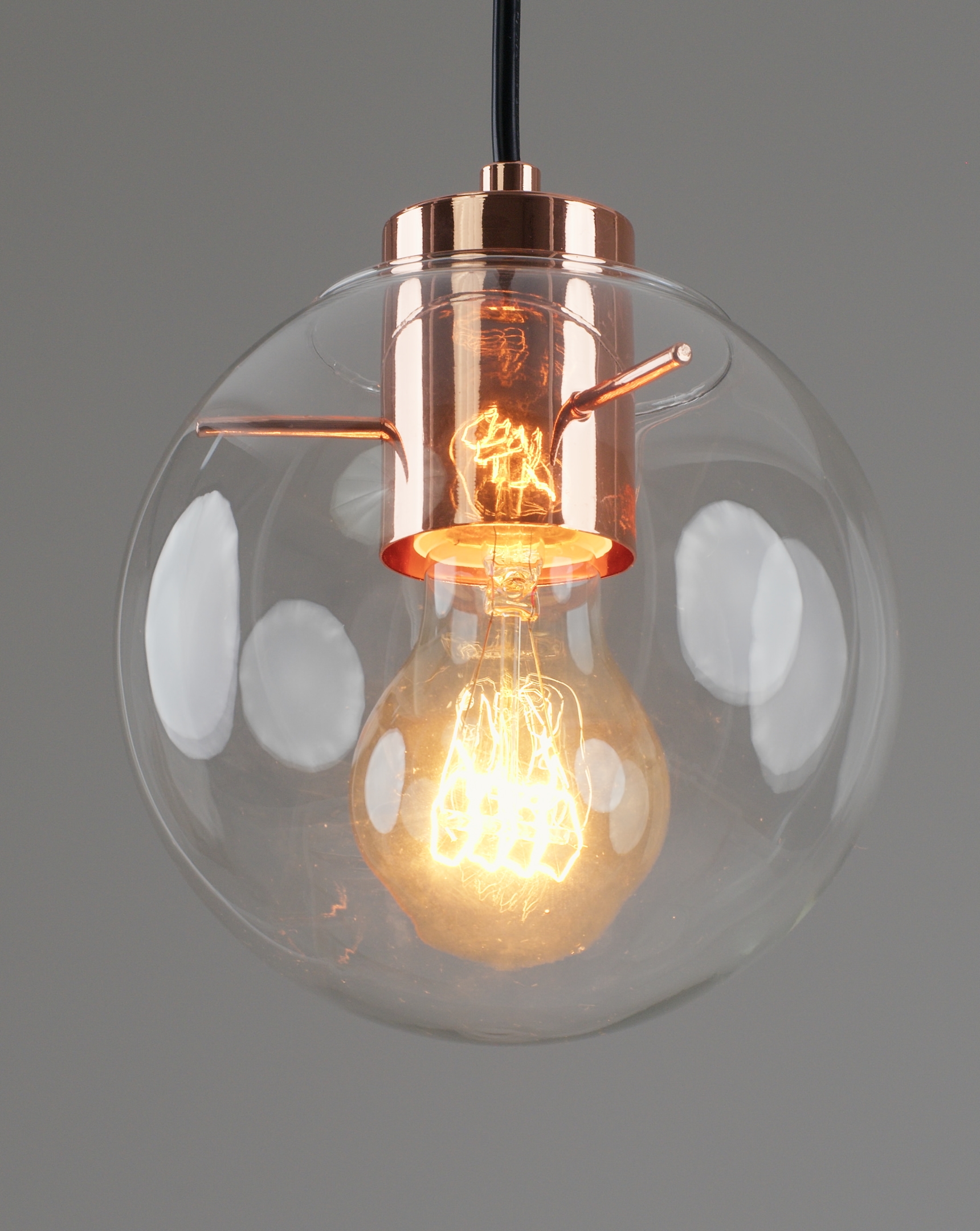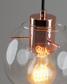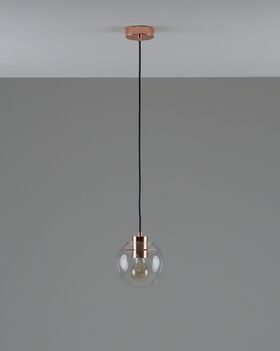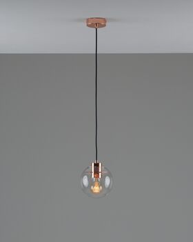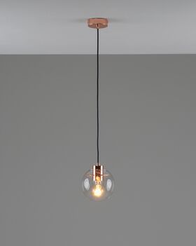Подвесной светильник в современном стиле с плафоном из прозрачного стекла и арматурой цвета розового золота. Диаметр стеклянного плафона 15 см, в качестве источника света могут быть использованы лампы накаливания или LED с цоколем Е27.