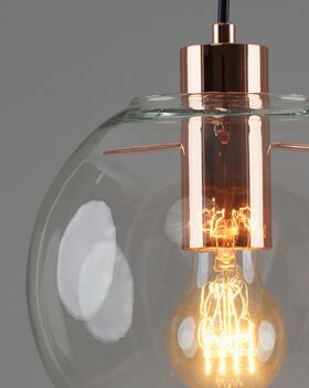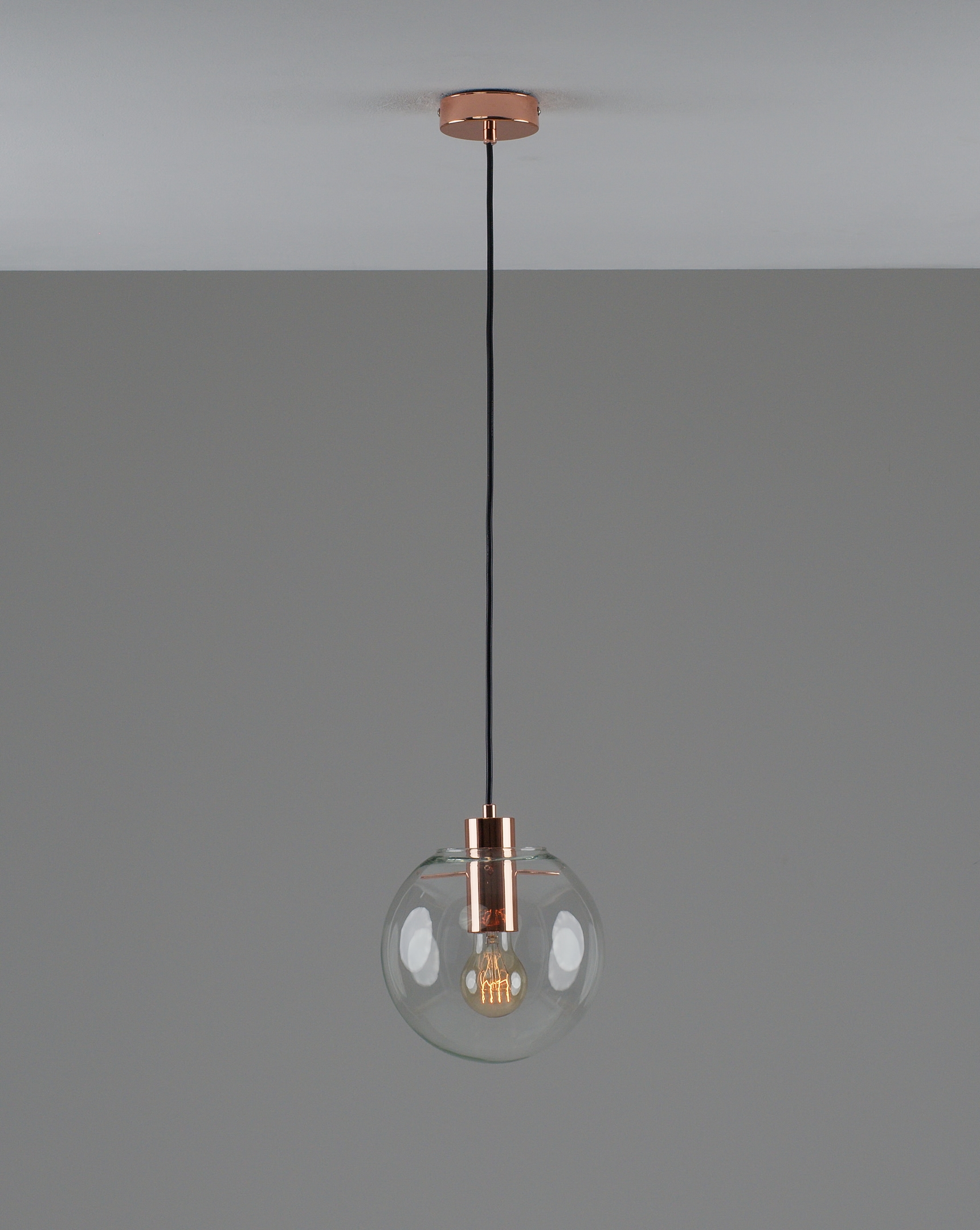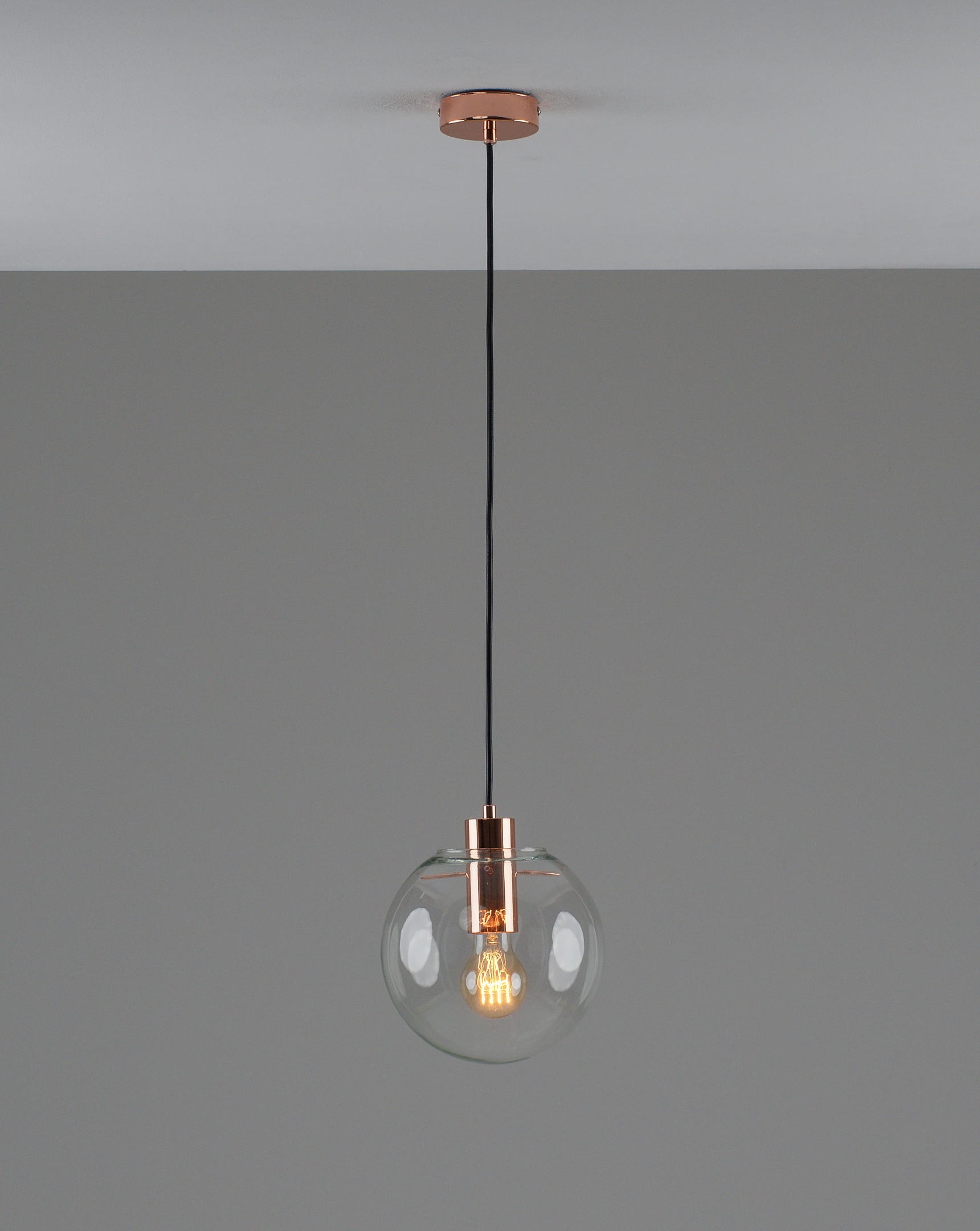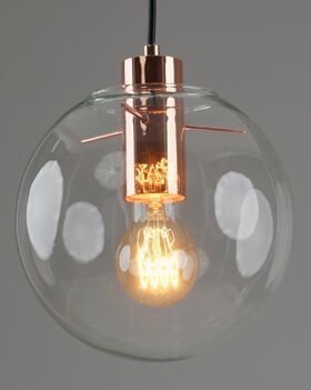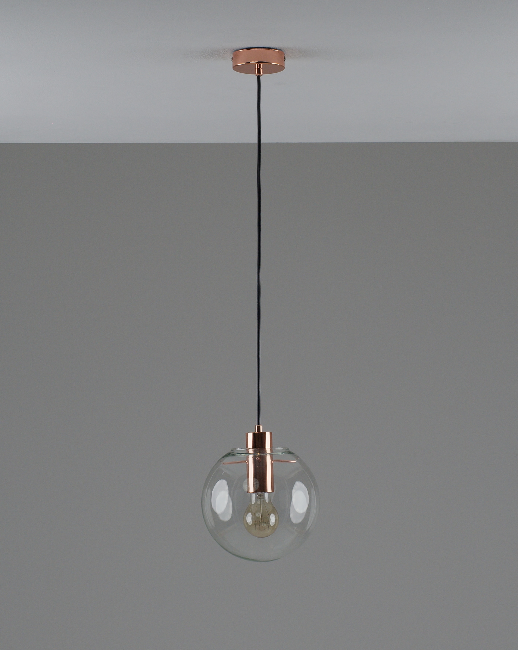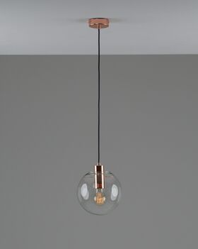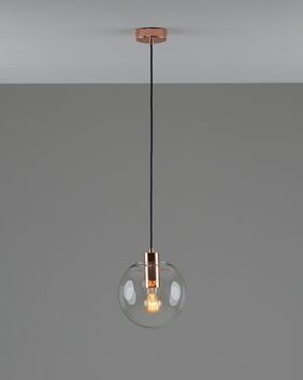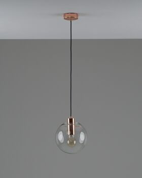 Подвесной светильник в современном стиле с плафоном из прозрачного стекла и арматурой цвета розового золота. Диаметр стеклянного плафона 20 см, в качестве источника света могут быть использованы лампы накаливания или LED с цоколем Е27.