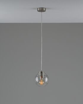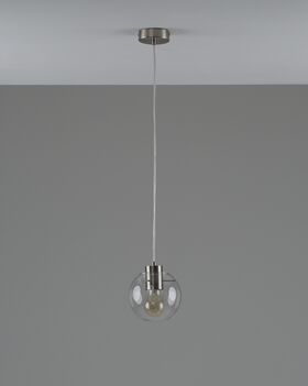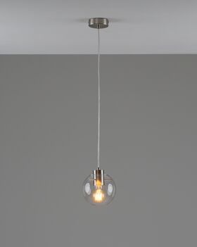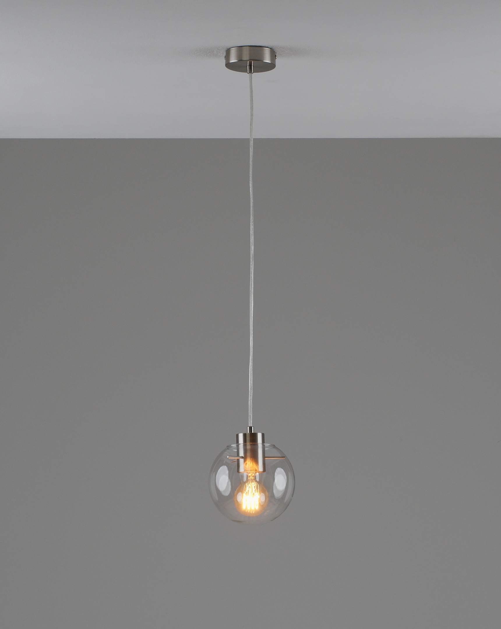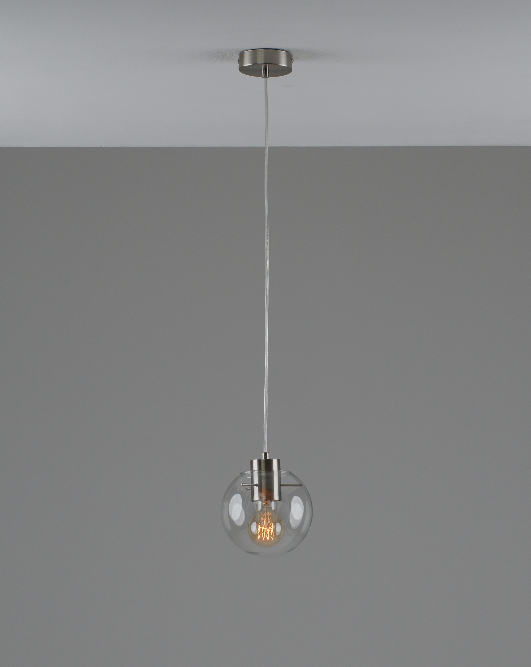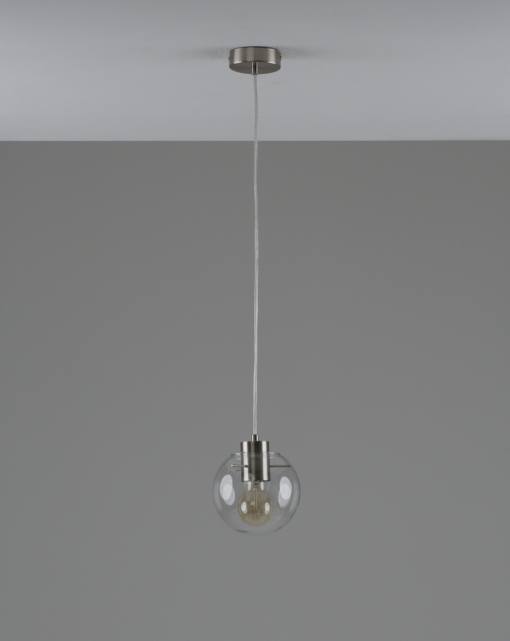 Подвесной светильник в современном стиле с плафоном из прозрачного стекла и арматурой цвета матовый хром. Диаметр стеклянного плафона 15 см, в качестве источника света могут быть использованы лампы накаливания или LED с цоколем Е27.