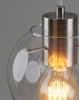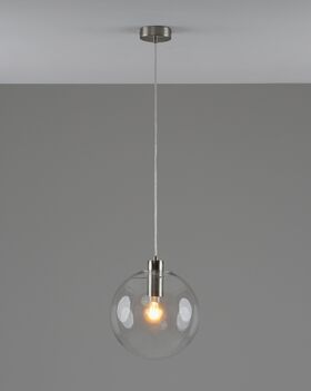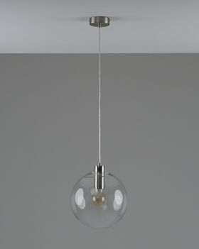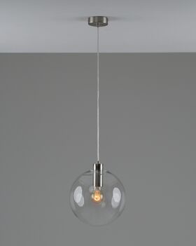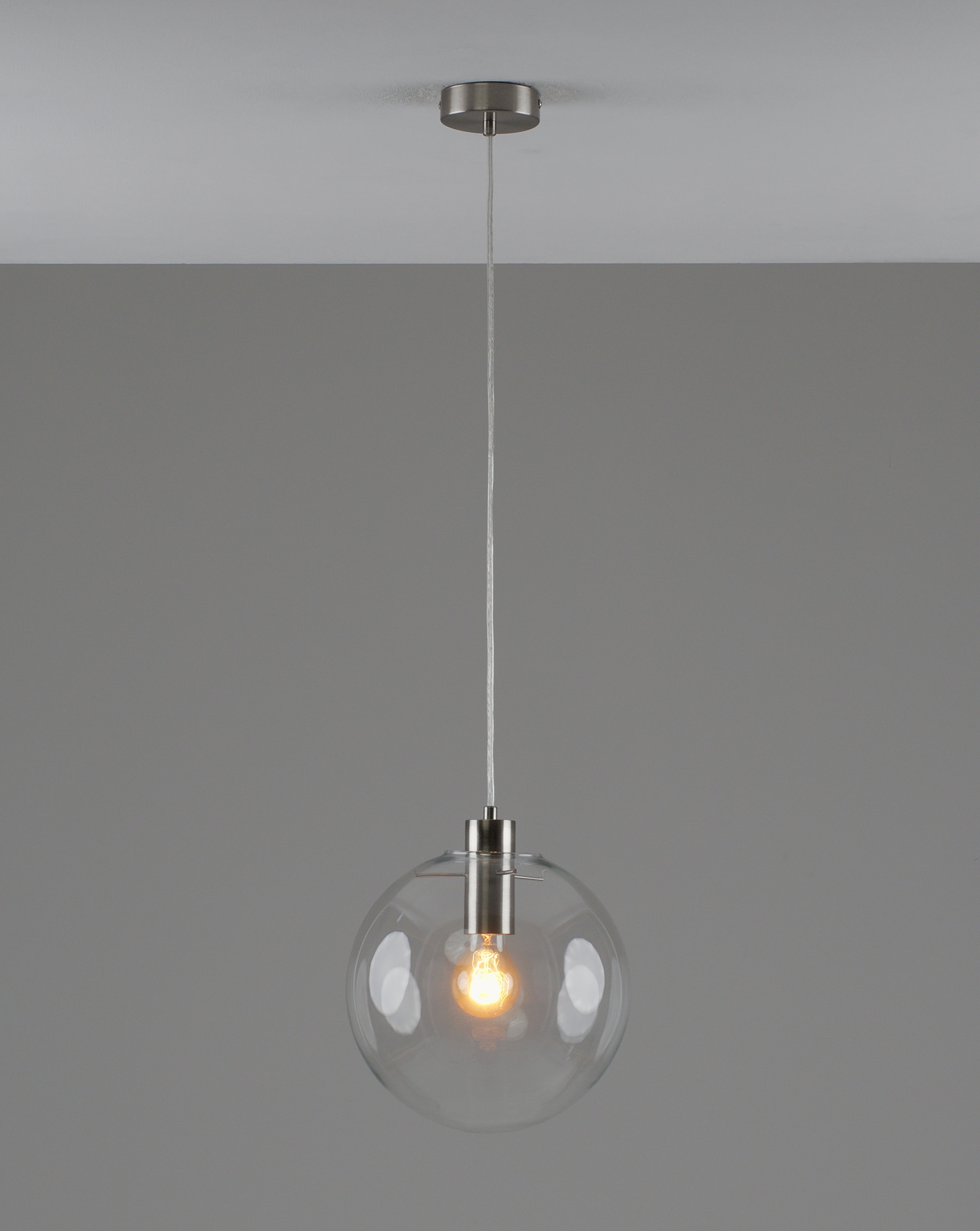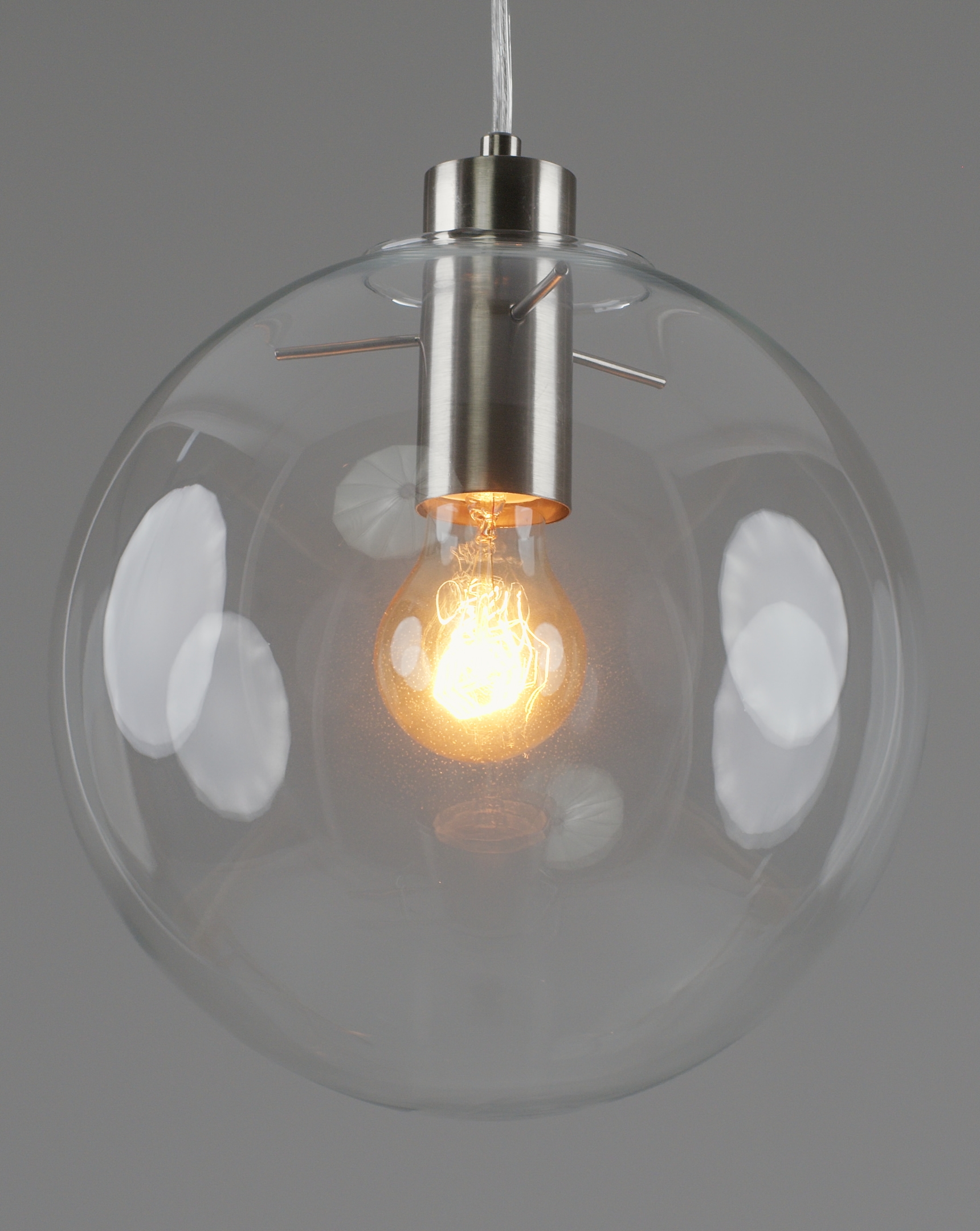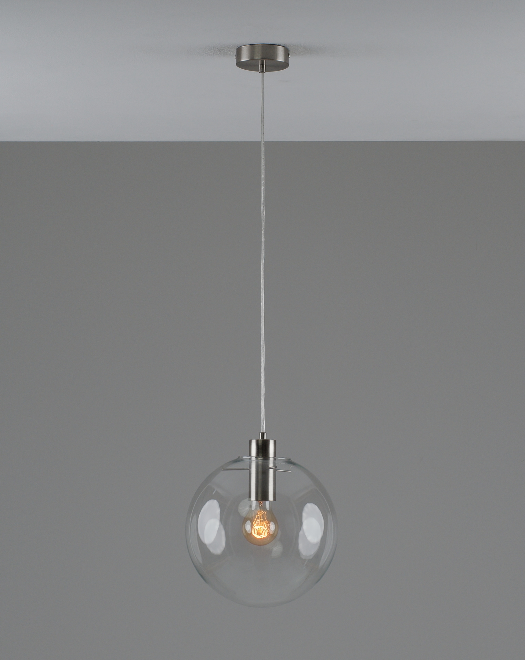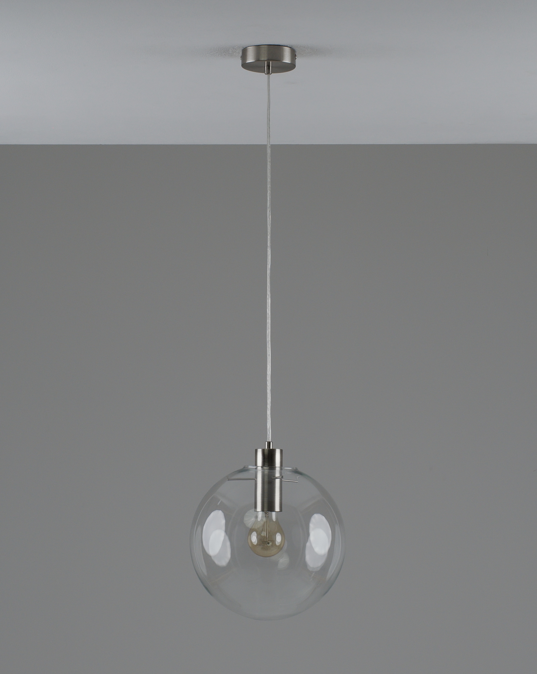 Подвесной светильник в современном стиле с плафоном из прозрачного стекла и арматурой цвета матовый хром. Диаметр стеклянного плафона 25 см, в качестве источника света могут быть использованы лампы накаливания или LED с цоколем Е27.