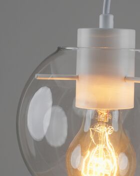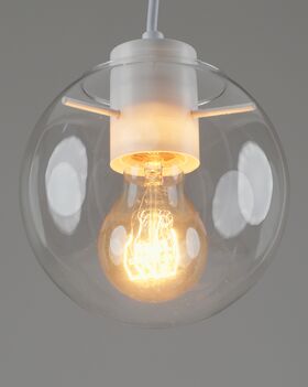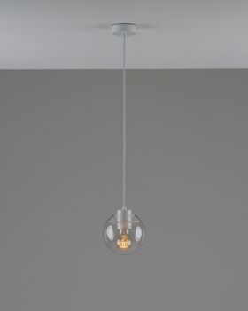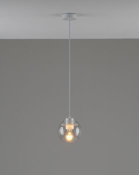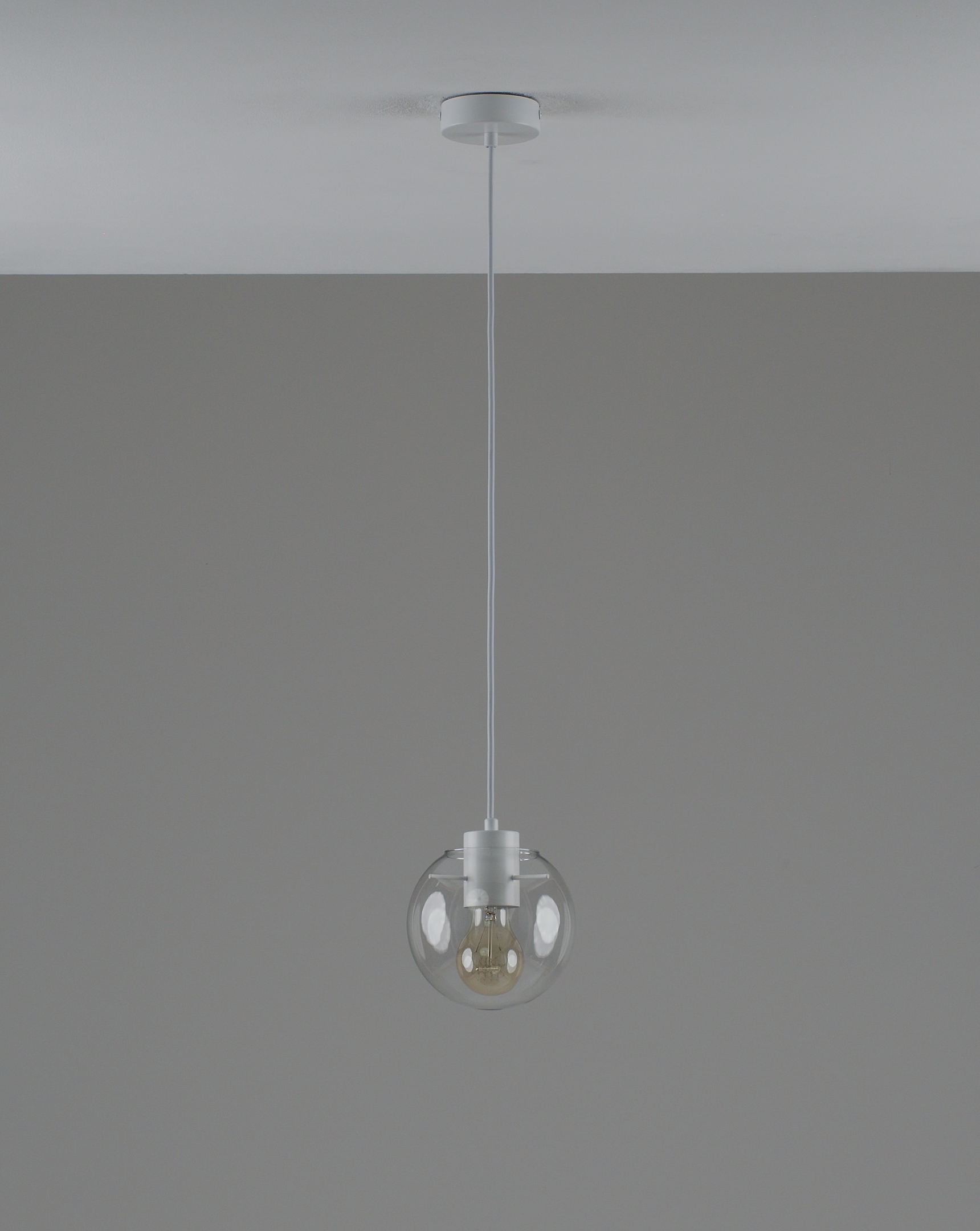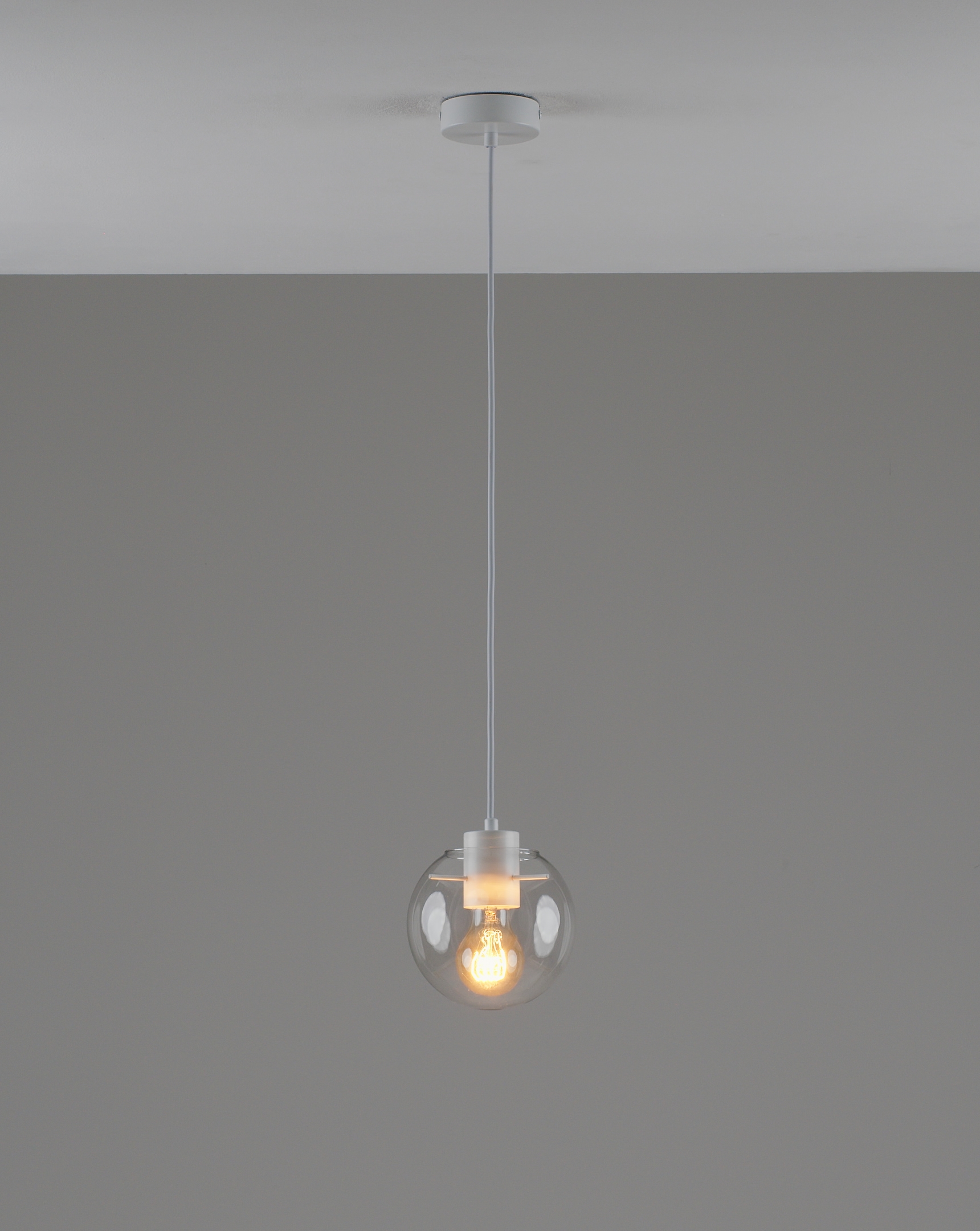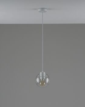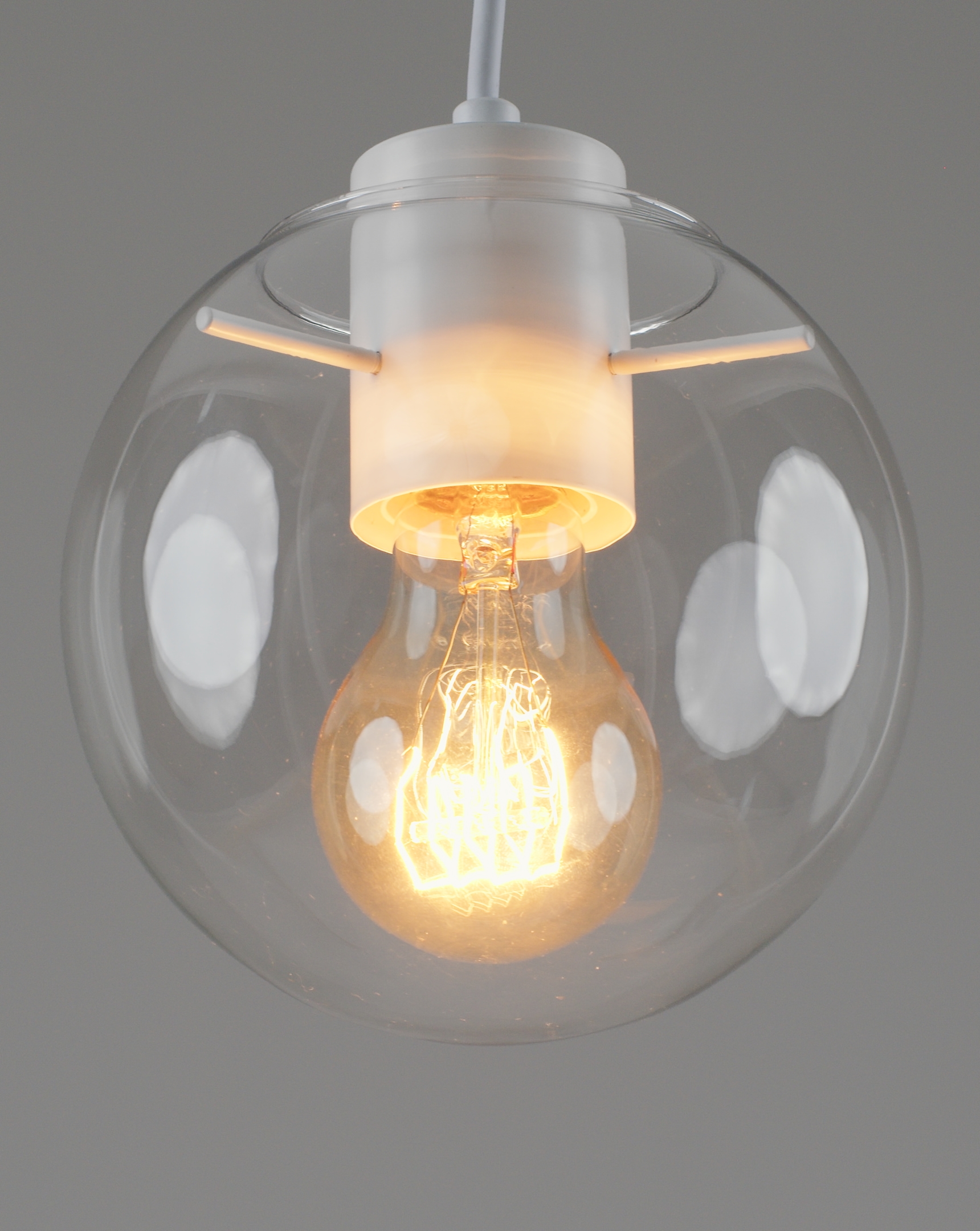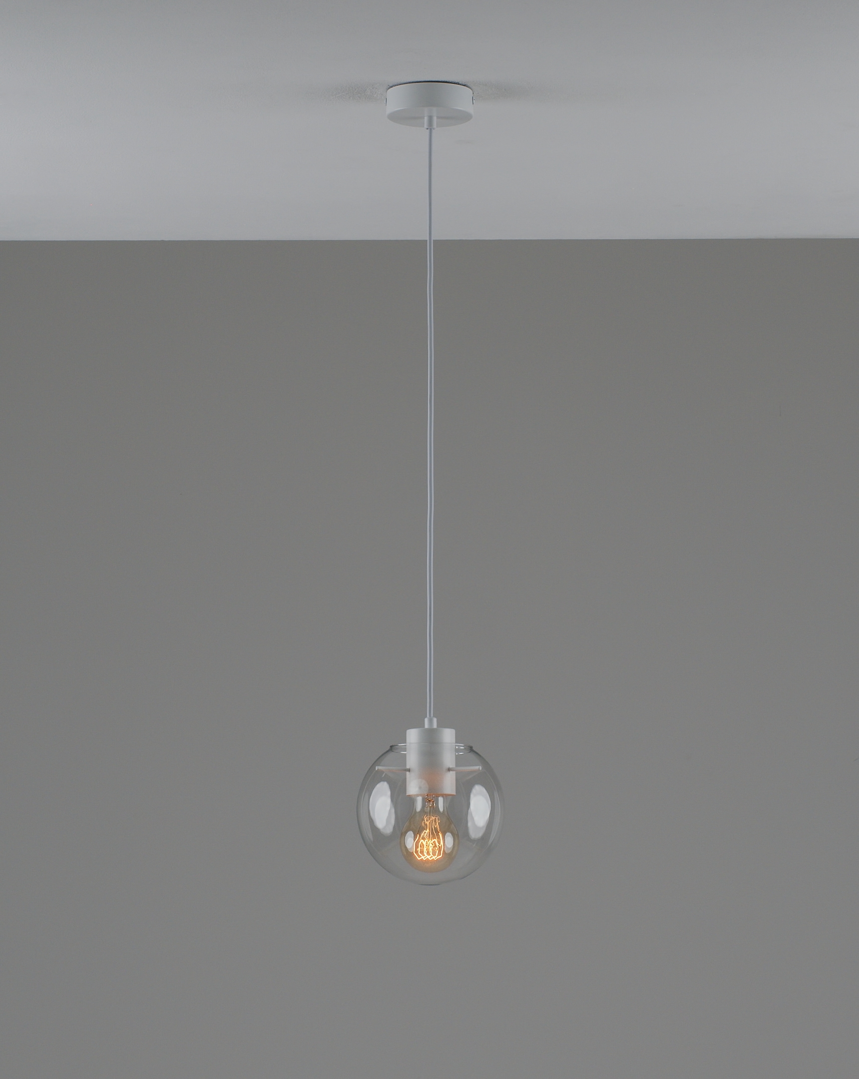 Подвесной светильник в современном стиле с плафоном из прозрачного стекла и арматурой белого цвета. Диаметр стеклянного плафона 15 см, в качестве источника света могут быть использованы лампы накаливания или LED с цоколем Е27.