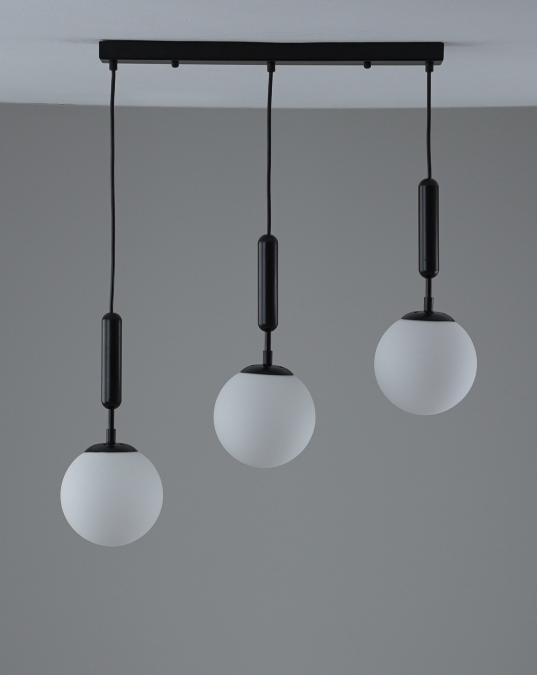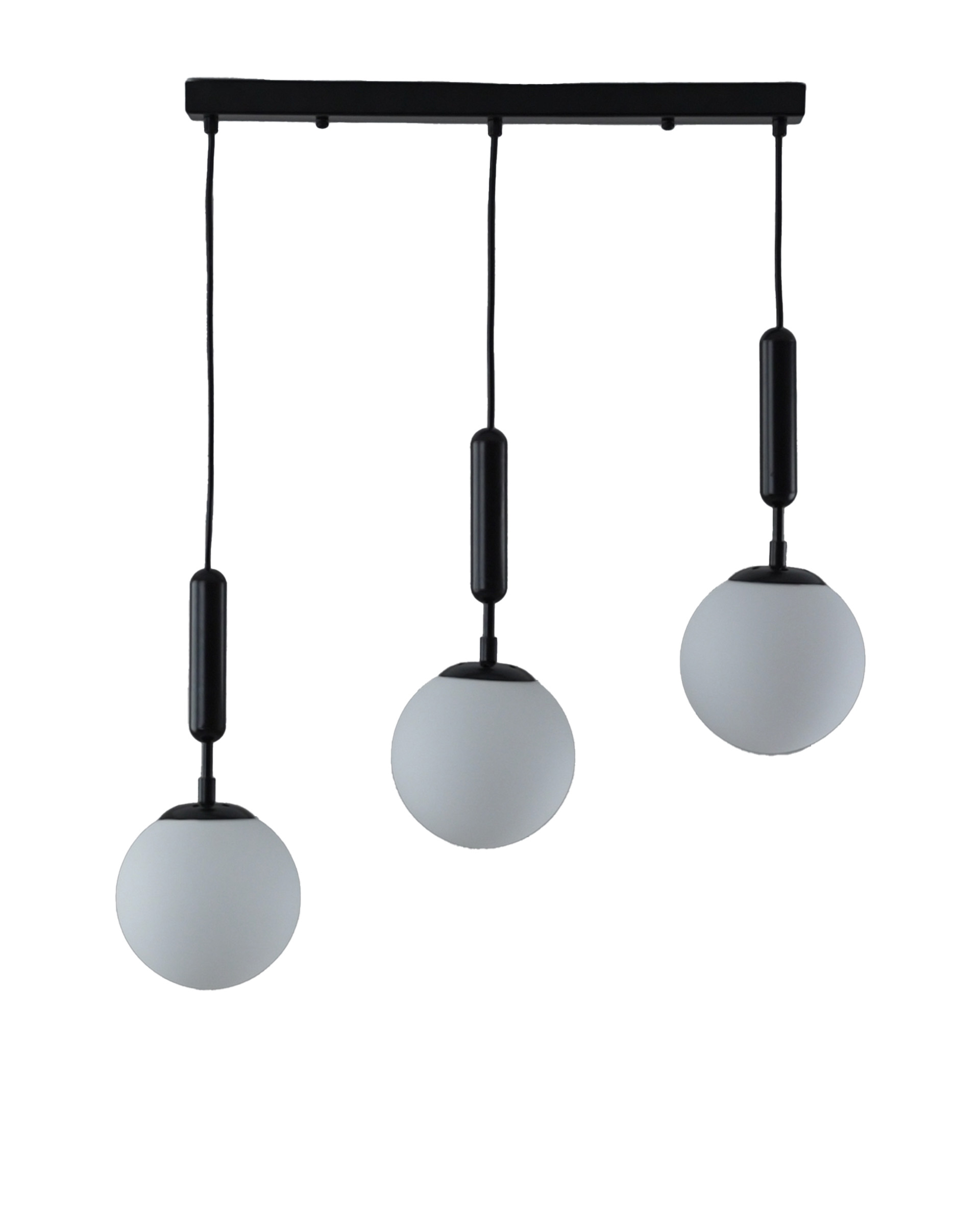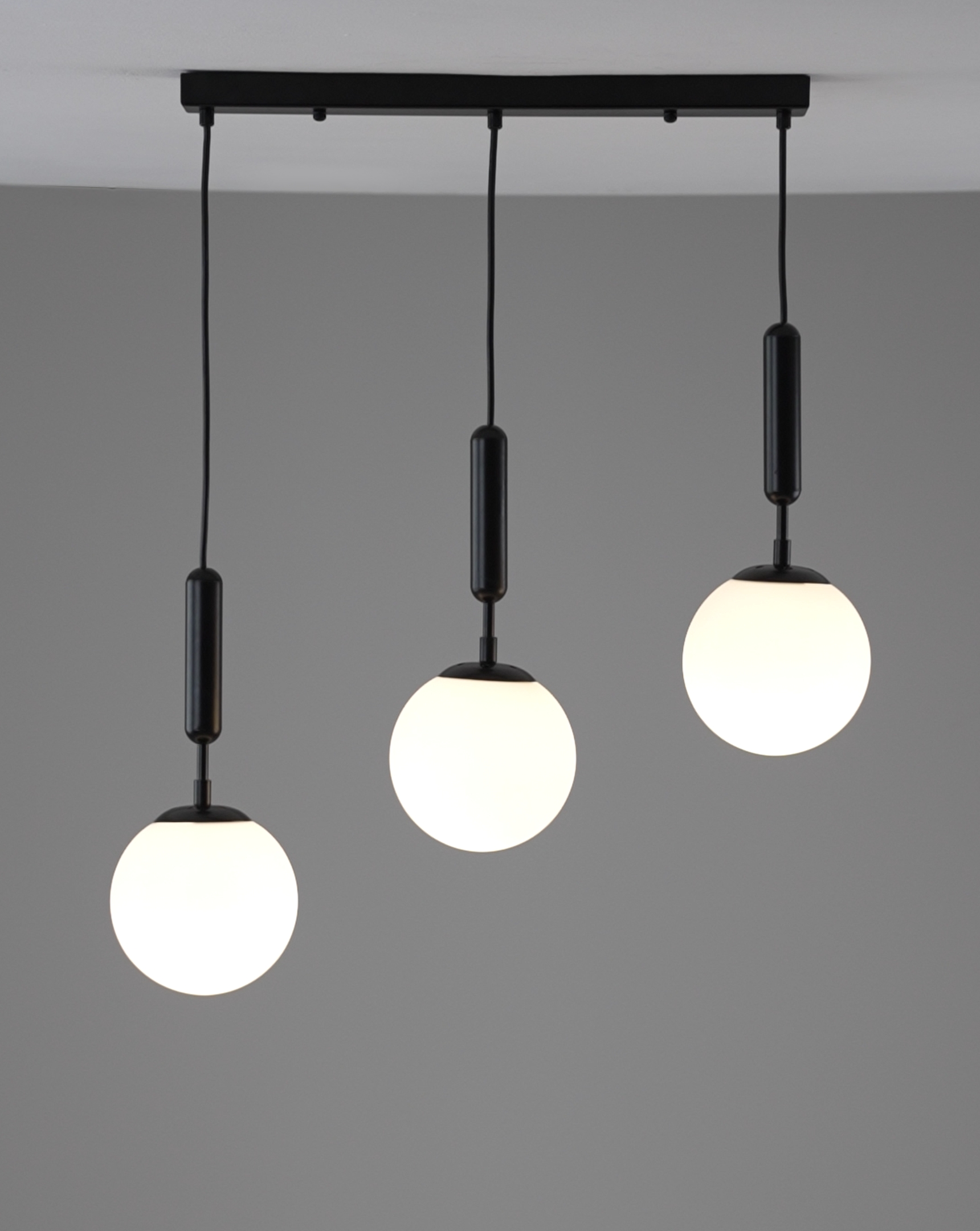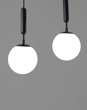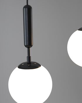 Подвесной светильник из коллекции Scrumbel. Металлический каркас черного цвета гармонично сочетается с матовыми плафонами в форме шара. Высота светильника 120 см., отличное решение для высоких потолков. Площадь освещения составляет 9 м?. Данная модель сможет дополнить любой современный интерьер дома и подойдёт для освещения спальни, кухни, холла или гостиной комнаты. При монтаже светильника, плафоны можно отрегулировать по высоте.