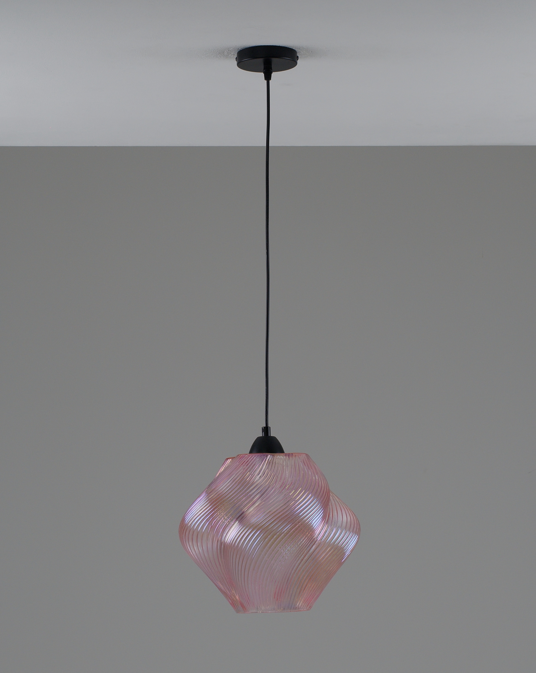 Современный стиль с характером. Модель выполнена в трендовой цветовой гамме, где розовое стекло сочетается с чёрным металлическим основанием. Круглая форма плафона с плавными изгибами делает светильник стильным акцентом, уместным как в домашнем интерьере, так и в кафе, гостиницах или других общественных пространствах.