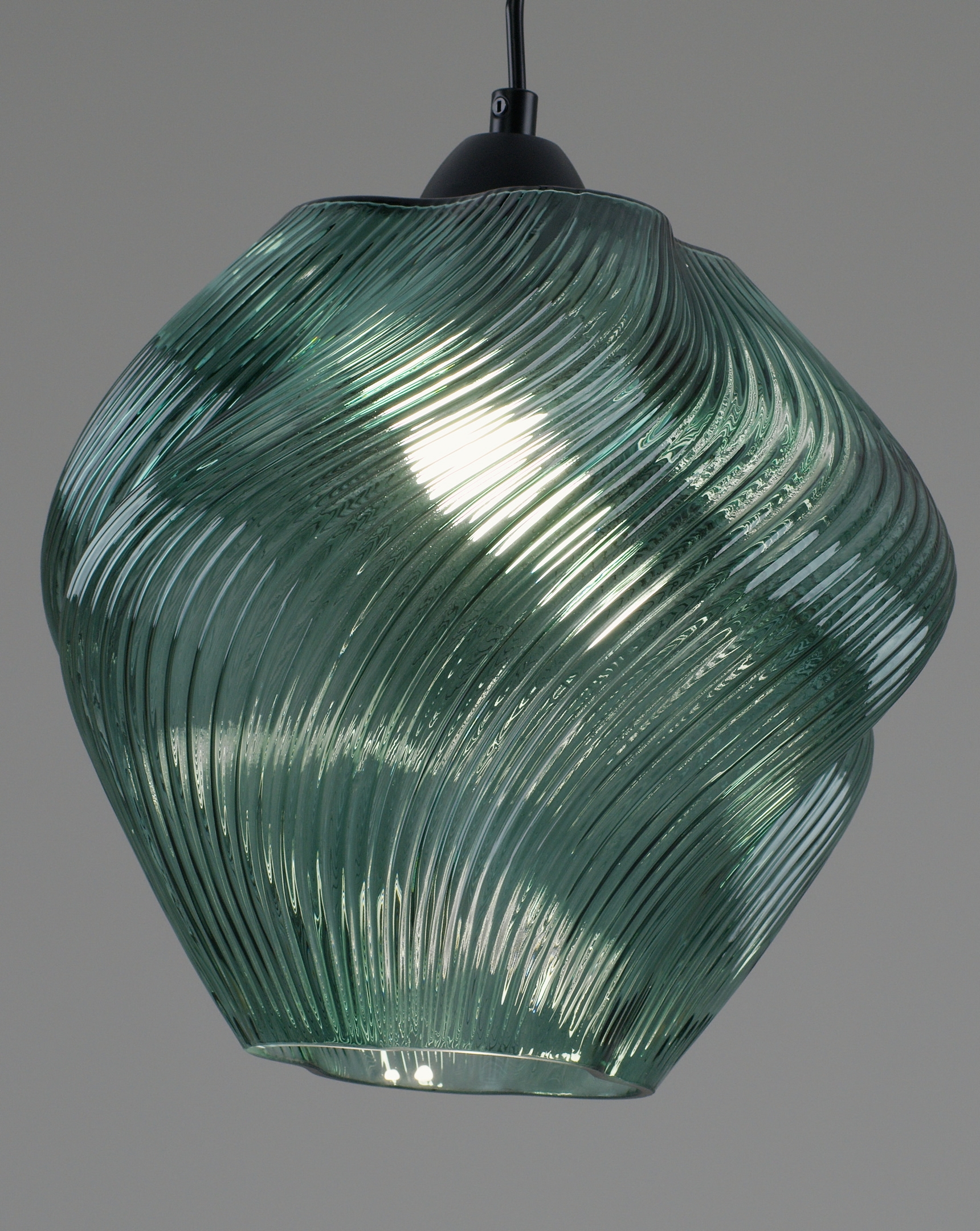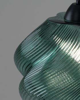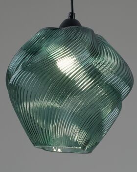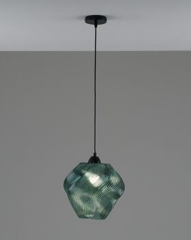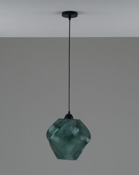 Подвесной светильник Rozy мгновенно привлекает внимание своей органичной формой и динамичным узором на стеклянном плафоне. Волнообразный рельеф придаёт ему живость и пластичность, а насыщенный тёмно-зелёный оттенок добавляет глубины. Прозрачность материала позволяет мягко рассеивать свет, создавая атмосферу уюта и расслабления.