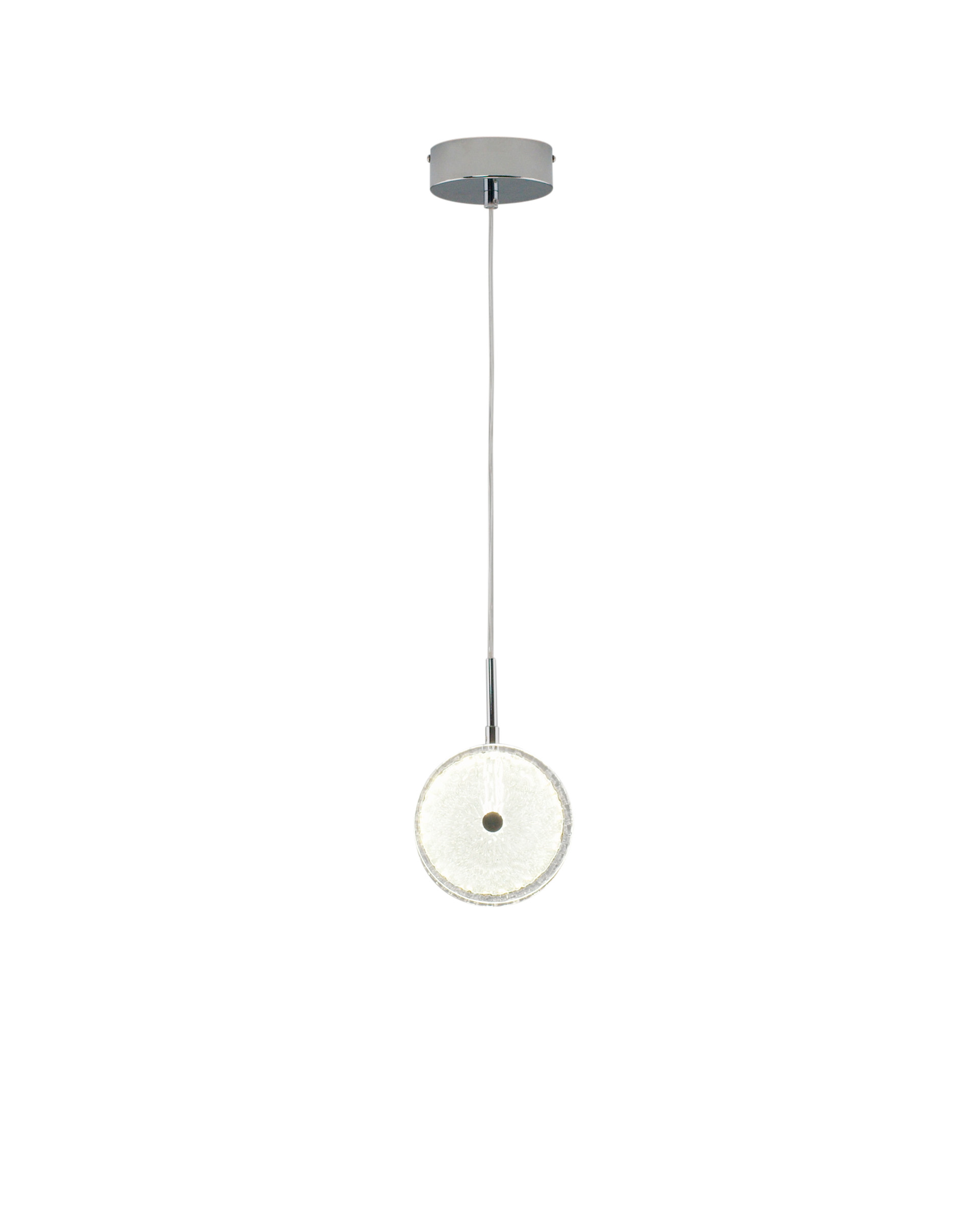 Элегантный дизайн. Подвесной светильник Marnia — это гармоничное сочетание минимализма и изысканного декора. Центральный элемент — круглый стеклянный плафон с рельефной фактурой, создающей эффект мерцающего сияния. Металлические детали с хромированным покрытием добавляют современности и утонченности.