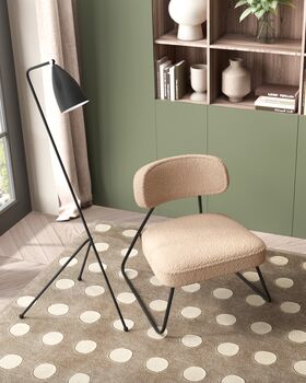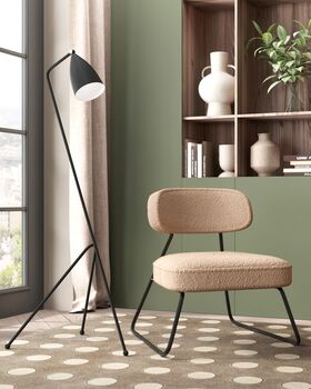 Лаконичный торшер в дизайнерском стиле. У основания три опорные ножки. Плафон выполнен из металла, окрашен в черный цвет, площадь освещения 3 м². Сдержанный дизайн делает серию Show подходящей под множество интерьеров в современном стиле. Светильник прекрасно дополнит интерьер спальни или гостиной.