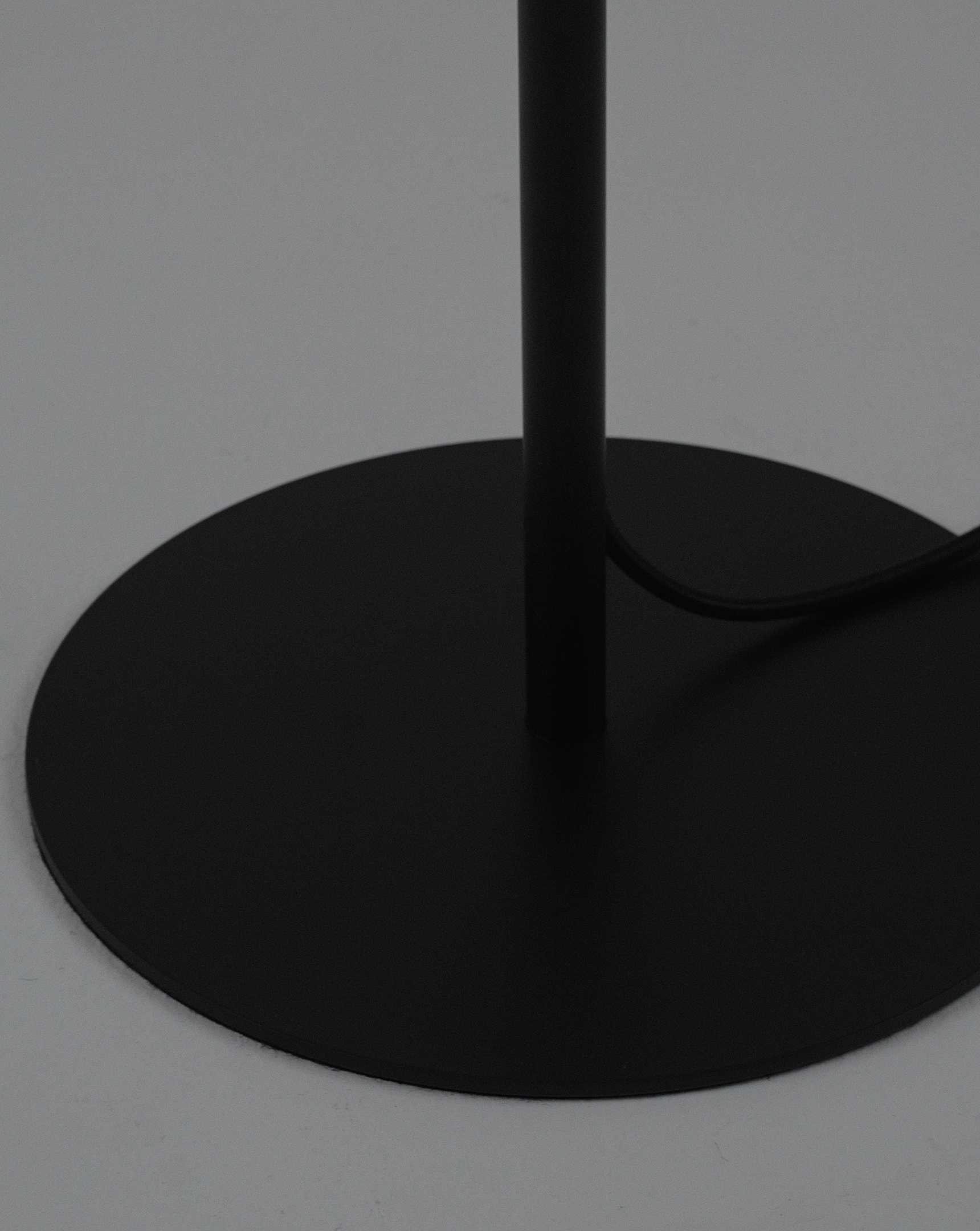 Цилиндрический абажур выполнен из плотной ткани, создающей мягкое рассеянное освещение. Основание и корпус изготовлены из прочного металла с матовым черным покрытием, что обеспечивает устойчивость конструкции и добавляет современную строгость образу.